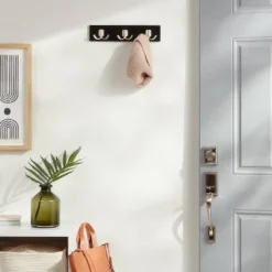 Upgrade the look of your space with a modern organization solution, the Modern Octopus 3-Hook Rail from Brightroom™. This black hook rail features nickel-finish hooks for an eye-catching look that complements most of your decor styles, and provides ample space for towels, bags and other items. Easy to mount on the wall, this metal hooks rail works well in a variety of spaces — from bathroom to bedroom and more.